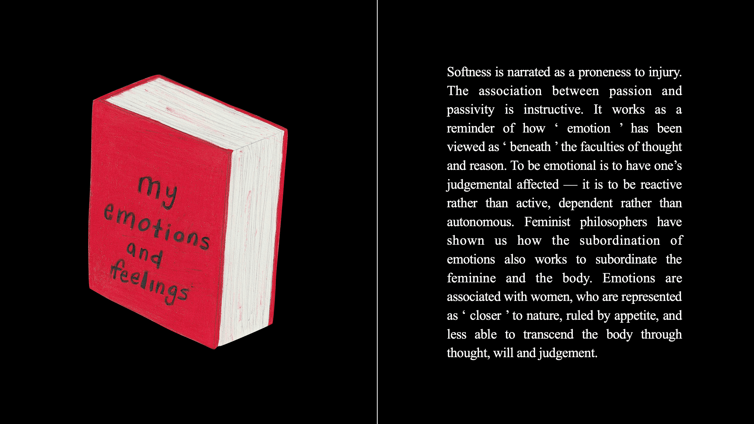 Re-Looking At The World From My Bedroom features excerpts from A Woman Looking At Men Looking At Women by Siri Husvedt (2016) — “A work of art has no sex. The sex of the artist does not determine a work’s gender, which may be one or another, or multiple versions thereof. ”