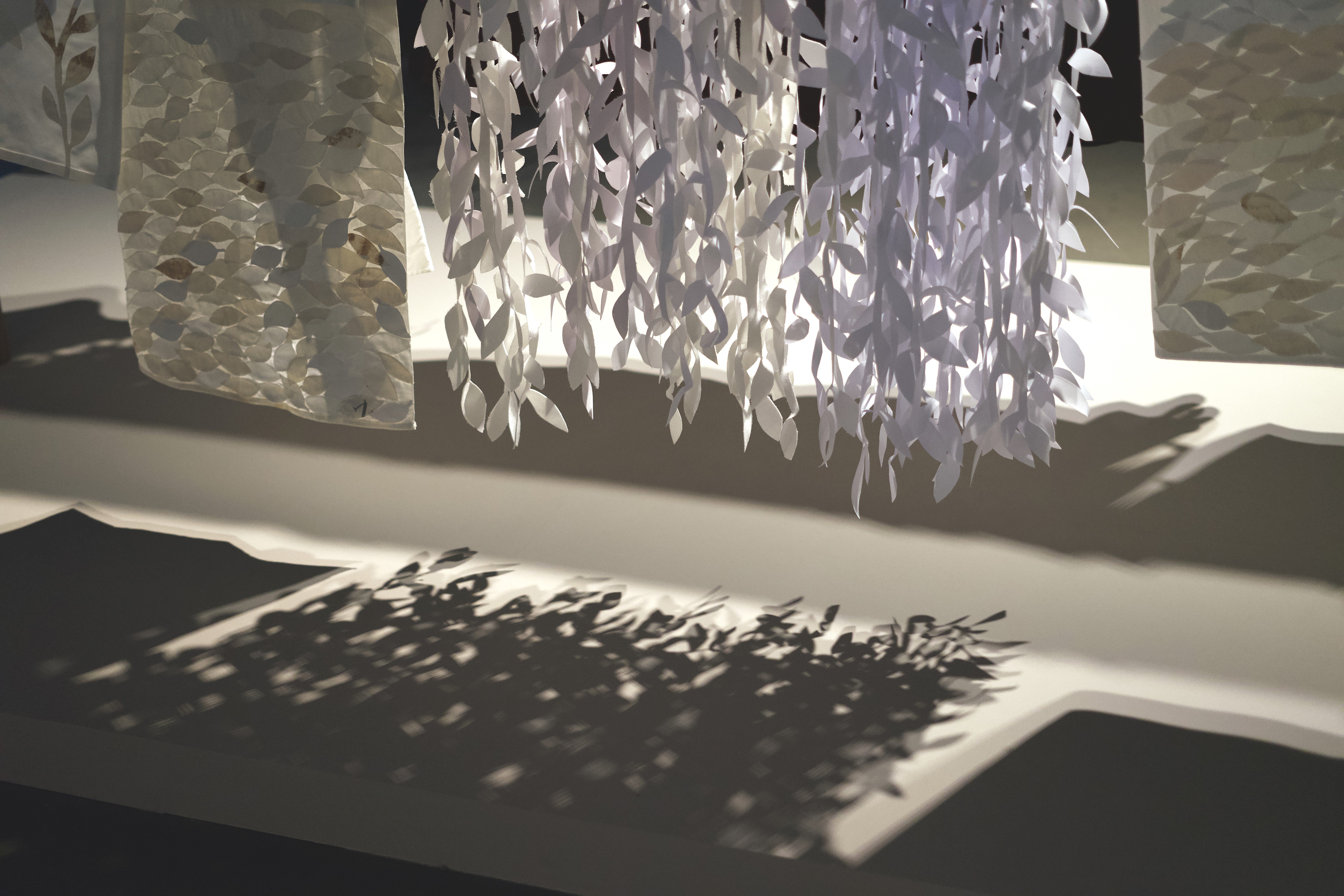 The work also speaks to the demands of household work and the tensions and inequalities it generates on top of all of life's numerous demands. The repetitive acts of washing, folding, and hanging are mirrored through layered patchwork textiles, evoking cycles of endurance and respite. The patterns of leaves that are sewn atop the textiles - meant to resemble leaves blowing in the breeze past these outdoor laundry lines - have been cut, assembled, and sewn on by hand, in an additional layer of labour by the artist.